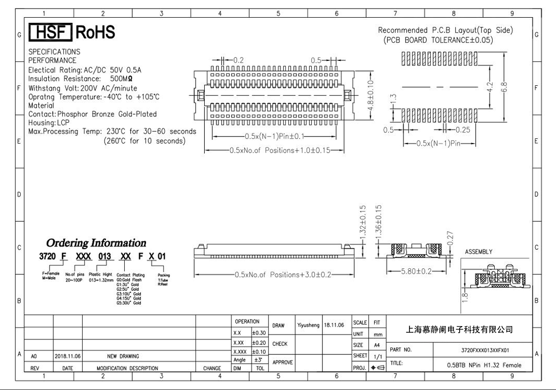 插针材料:黄铜或磷青铜;绝缘体材料:塑胶UL94V-0。