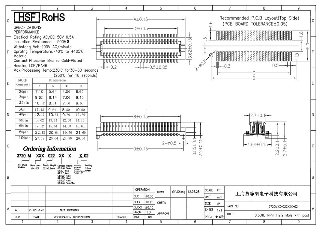 耐电压:150V~250V额定电压:50V输出电流:0.5A绝缘电阻:1000MΩ Min接触电阻:20mΩ Max间距:0.5mm,0.6mm,0.635mm,0.8mm,1.0mm,1.25mm,2.0mmPIN位:10 至 140PIN