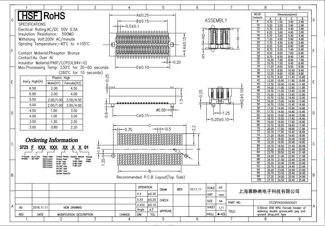 插针材料:黄铜或磷青铜;绝缘体材料:塑胶UL94V-0。